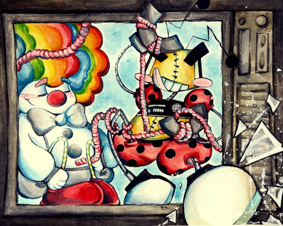 "Cartoon Birth" (Watercolor + Acrylic + Pen) 10x16
